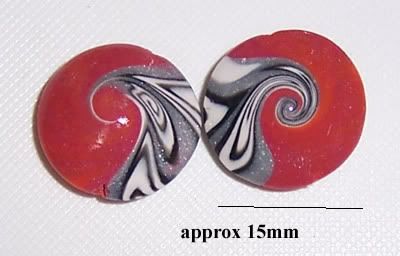 Set of 2 greyscale + orange/red swirls lentil beads.
