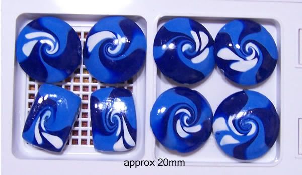 1 set of 8 dark blue + light blue swirled beads. 6 lentils + 2 rectangular.